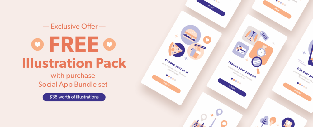 - Get a FREE Landing illustrations kit ($58 worth of illustrations) with purchase this Food App Bundle set