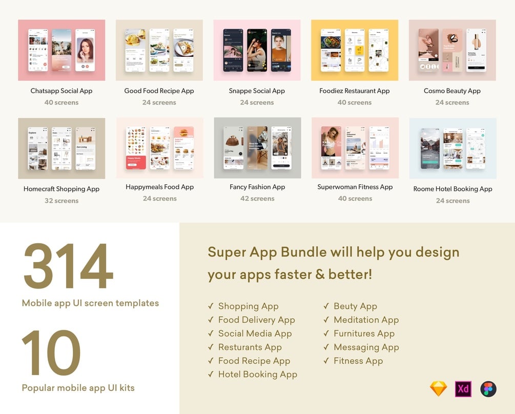 - This Super App UI Kit Bundle includes 10 sets of UI Place popular app UI kits and 3 sets of UI Place illustration kits